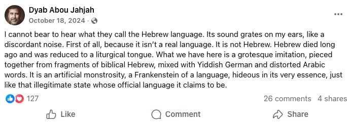A year later in October 2024, he called the modern “Hebrew language” a “Frankenstein of a language, hideous in its very essence, just like that illegitimate state whose official language it claims to be.”